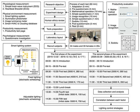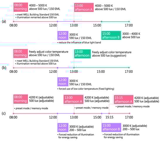 However, based on the literature review, few studies have comprehensively considered the lighting condition with regard to physiology, psychology, work efficiency, and energy consumption. Furthermore, almost no relevant lighting experiments have been conducted in Taiwan [57]. Therefore, this paper aims to research the effects of CCT and illuminance on human psychology, physiology, and work productivity and to propose a personalized lighting control schedule for offices. Five kinds of light situations—three fixed lighting and two adjustable lighting modes—were applied to 67 subjects in this experiment. The experiment was conducted in a lighting laboratory without daylight. Users’ results were collected to analyze the differences in personal preferences, physiological changes, and productivity for these lighting conditions. Then, we compared the relationship and correlation of each variable factor and finally proposed some recommended lighting control schedules based on the experimental analysis. The originality of this study lies in three aspects: