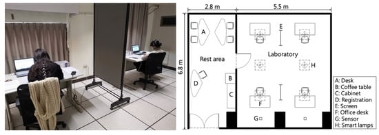 The smart air conditioning and lighting laboratory is located in the National Cheng Kung University (NCKU), Taiwan. The panorama and plan of the laboratory are shown in Figure 2. The smart lighting system is applied in the laboratory, which consists of adjustable lamps and a mobile app. There is an intelligent lamp above each seat, and the size of each intelligent lamp is 601 × 601 × 13 mm. When the lamp is turned on, it automatically connects to the app via Bluetooth. Then, the luminance and CCT of each lamp can be adjusted by subjects in the app. The preset CCT is 4000 K, and the luminance is 500 lux. The preset state was restored each time the light was turned off and then on again. In this study, a spectrometer was used to measure the horizontal illumination, CCT, and EML at the desktop. In the experiment, the minimum and the maximum values of CCT were 3000 K and 5500 K, respectively. The illuminance level on the desktop was from 170 lux to 590 lux, while the EML value was between 120 and 300.