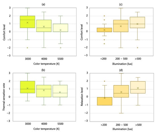 Comfort level and thermal sensation votes of different CCTs and illumination: (a) The comfort level of subjects under different CCTs; (b) The difference in psychological evaluation of thermal sensation under different CCTs; (c) The comfort level under different levels of illumination; (d) The relaxation level under different levels of illumination.