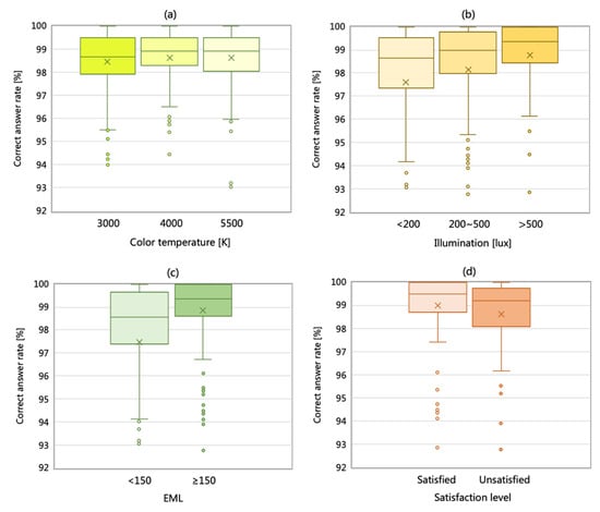 Correct answer rates of different CCTs, illumination, EML, and satisfaction level: (a) The effect of CCTs on work productivity; (b) The effect of illuminance on work productivity; (c) The effect of sufficient and insufficient 150 EML on work efficiency; (d) The effect of a comfortable lighting environment on productivity under the condition of sufficient 150 EML.