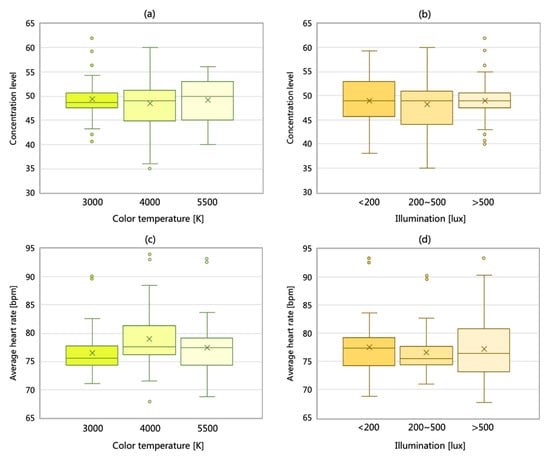 Figure 5a,b show no significant difference in brain waves under different CCT and illumination conditions. The average values of the concentration level in each lighting environment were maintained at 49. When the CCT was at 5500 K, the average value of concentration level was relatively higher than others. Meanwhile, the values of the concentration level of each subject were similar in the conditions of CCT at 3000 K and illuminance higher than 500 lux. In Figure 5c, the heart rate of subjects changed considerably in different CCTs, which reached the highest average value of 78 bpm when the CCT was 4000 K. On the other hand, in Figure 5d, under different illumination conditions, the average heart rate value was approximately 77 bpm. However, the change range of heart rate was larger with the increase of the illumination. Therefore, although the relationship between light conditions and physiological change was not obvious, the heart rate could offer additional research opportunities with regard to adjustable lighting mode.