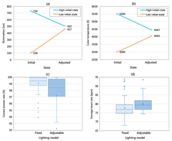Illumination and CCT in different states of adjusted lighting and answer rate and average heart rate in fixed and adjusted state: (a) Illumination in different states of adjusted lighting; (b) CCTs in different states of adjusted lighting; (c) The correct answer rates in fixed and adjusted state; (d) The average heart rates in fixed and adjusted state.