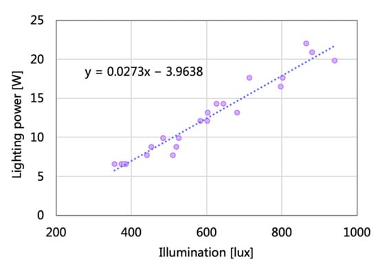 If energy-saving and carbon reduction are considered demands of the lighting control strategy, the main influence factor of energy consumption is illuminance value. Therefore, for energy-saving lighting, the design purpose is to reduce the illumination value as much as possible while ensuring normal operations can be carried out without limitation. Figure 4b shows the relationship between the horizontal illumination value and work productivity. Illumination above 500 lux has the highest work efficiency. The formula in Figure 7 shows that the power of the horizontal illuminance of 590 lux is about 12.1 W, while that of the horizontal illuminance of 450 lux is about 8.8 W. Therefore, decreasing the horizontal illumination from 590 lux to 450 lux can save 3.9 W energy power of each lamp but may also lose 0.83% of each person’s productivity.
