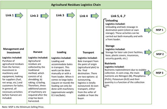 Agricultural residue logistics chain. It consists of 7 links with three minimum selling prices (MSPs) as output.