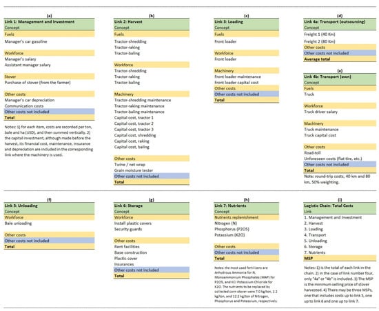 Following the logistics chain of agricultural residues and the cost structure defined in the previous sections, a case study was carried out for the corn stover. The final stage of the chain, in which the estimated costs of the seven links must be added, is called the total cost.