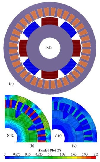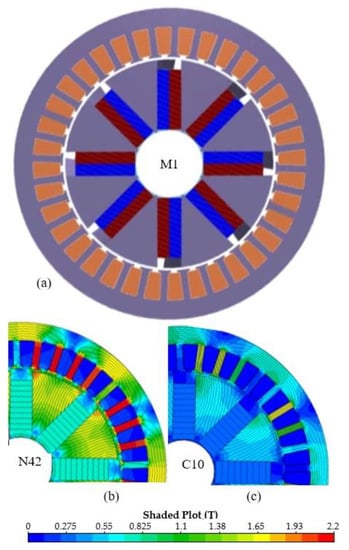 Radial machine: (a) general view, (b) magnetic flux density in the stator and rotor core of N42 PM machine, (c) magnetic flux density distribution in the stator and rotor core of C10 PM machines.