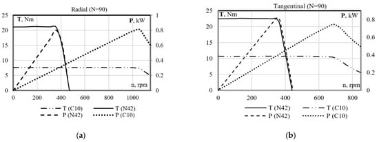 Electromechanical characteristics of the tangential and radial machines with N42 and C10 PMs for N = 90 turns. Here, the X-axis defines the speed of the machines and the Y-axis shows the torque and output power.