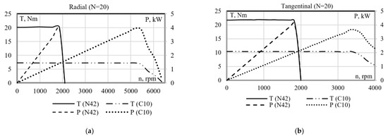 On the other hand, the maximum output power of the radial machine with N42 PMs (Figure 2b) is the same as that of the tangential machine with rare-earth magnets: 0.8 kW at a speed of 380 rpm. The same power is observed in the machine with C10 PMs, however, at a speed of 1060 rpm. The maximum torque (T) of the tangential and radial machines with N42 PMs (Figure 3a,b) is also similar: 23 Nm for the tangential; and 22 Nm for the radial. This torque is constant for both machines at the speed range of 0–380 rpm. For the machines with ferrite magnets, the torque is 10.5 Nm for the tangential; and 7.8 Nm—for the radial machine. Additionally, the constant torque speed range for these machines is as follows: 0–690 rpm for the tangential machine; and 0–1100 rpm for the machine with radial PMs. When the number of turns in both machines is decreased to N = 20, the torque and power characteristics change, as portrayed in Figure 4. Now the maximum output power of the tangential and radial machines with N42 PMs is five times higher than the machines with N = 90 turns (Figure 4a,b).