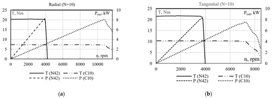 Electromechanical characteristics of the tangential and radial machines with N42 and C10 PMs for N = 10 turns. Here, the X-axis defines the speed of the machines and the Y-axis shows the torque and output power.
