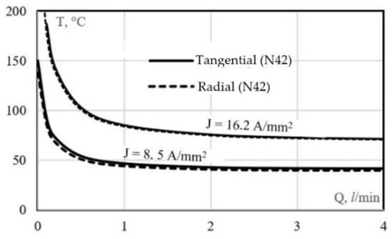 Temperatures of the neodymium magnets (N42) in the tangential and radial machines at various water flow rate of the liquid cooling system. Here, the X-axis defines the flow rate of the system and the Y-axis shows the temperature of the machines.