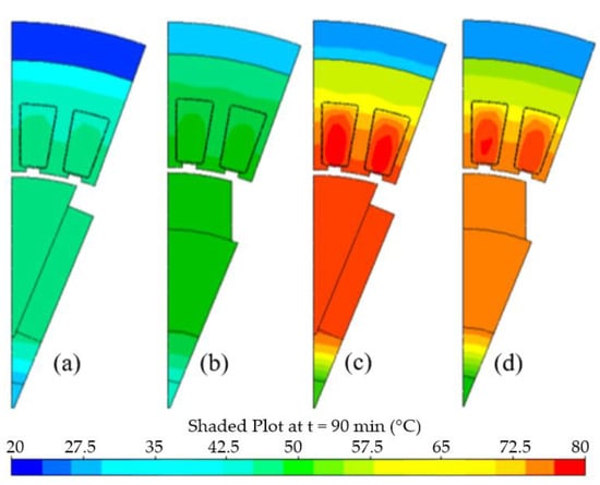 Thermal models of the tangential and radial machines with various current density (J) in the winding: (a) tangential machine with J = 8.5 A/, (b) radial machine with J = 8.5 A/, (c) tangential machine with J = 6.2 A/, (d) radial machine with J = 16.2 A/.