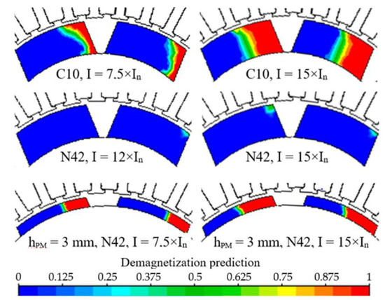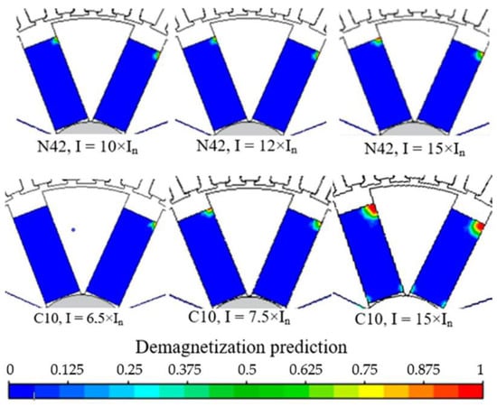 In the ferrite magnets (C10), the demagnetization starts at the current I = 6.5 × . When this current increases to I = 7.5 × , a more significant part of the PMs is irreversibly demagnetized. Finally, when the stator current surges to I = 15 × , the volume of the demagnetized PMs is three times higher than that of the N42 magnets at the same current. The neodymium magnets of the radial machines (Figure 10) start to demagnetize at I = 12 × , and this condition exacerbates when the current increases to I = 15 × .
