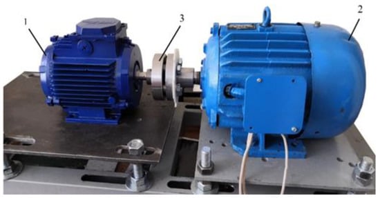 The experimental assembly used for measuring the output characteristic of the machines is shown in Figure 12. On this stand, an experimental sample of the generator 1 with the help of a drive asynchronous motor 2 is set in rotation with a given frequency from the frequency converter. The shaft of the drive motor and the generator under test are connected by means of a coupling 3.