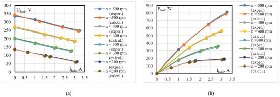 The terminal voltage of both machines (Figure 13a and Figure 14a) decrease when the load current increases. This is due to the voltage drop across the winding resistance. The experimental and calculated values of these voltages match with a negligible discrepancy of 1%. This indicates the accuracy of the 3D FEM model of the machines. The output power of the machines indicated in Figure 14a,b demonstrates the same accuracy between the experimental and calculated results. The output power of the machines at a speed n = 500 rpm continues to rise with the current loading of 3.5 A and higher, whereas the power of these machines at n = 400 rpm approaches its peak value at this load.