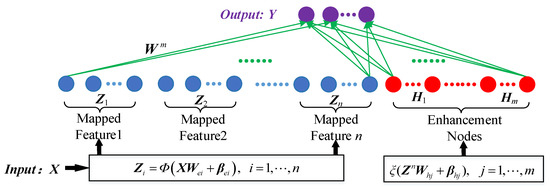 where Whj and βhj are the random weights matrix and the random bias matrix of enhancement node, respectively, and ξ(∙) is the nonlinear activation function. Hence, in mathematical terms, the network output Y of the BLS can be denoted as in Equation (8):