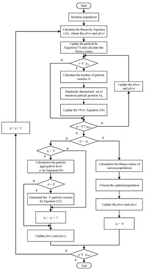 In later iterations a large number of particles concentrates in a narrow area and the optimization result easily falls into local optimization, from which it is difficult to emerge. Compared with PSO, the multiple uniformly distributed particle populations are regenerated near the current optimal solution via the jump operation and the new optimal solution is obtained via multi-step iterative competition. In this paper, the later iteration is defined as g > 0.7 gmax. Meanwhile, the particle aggregation level is used as the trigger threshold in the jump operation, which can be expressed as in Equation (20):