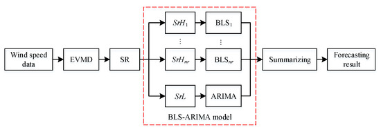 Flowchart of EVMD-SR-BLS-ARIMA for ultra-short-term wind speed forecasting.