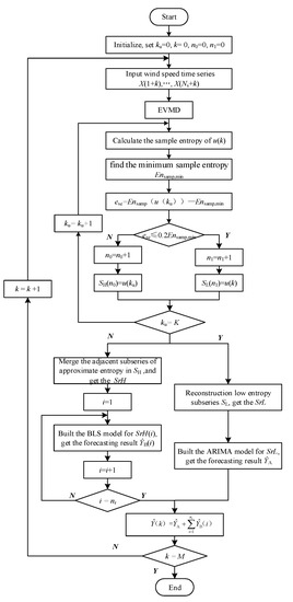 - A novel and robust hybrid prediction model (EVMD-SR-BLS-ARIMA) is proposed and employed for ultra-short-term wind power forecasting. This avoids the time-consuming training of a deep structures model. This paper introduces BLS, which is time-efficient and constantly updates the parameters of the forecasting model, to ultra-short-term wind speed forecasting. The forecasting results of nascent high- and low-entropy subseries are calculated using the BLS and ARIMA models. In order to improve the forecasting accuracy, an error-corrected EVMD-SR-BLS-ARIMA model is developed to post-process the errors.