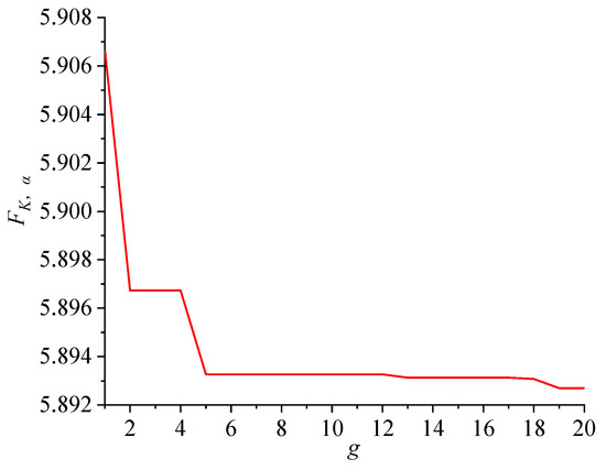 Figure 8 depicts the variation curve of the minimum average envelope entropy value in the EPSO optimal value search with the number of iterations, g; the parameters of variational mode decomposition are then determined as K = 6 and α = 5.67.