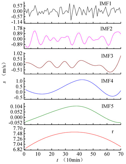 The first 70 wind speed data points were subjected to EVMD to generate six mode functions (u1, …, u6), as shown in Figure 9. In order to compare the validity of decomposition, the wind speed data were decomposed using ensemble empirical mode decomposition (EEMD). When the standard deviation of Gaussian white noise was set to 0.4 and the noise order was set to 50 in EEMD, the wind speed data were decomposed into five IMF components and one residual component, r, as shown in Figure 10.