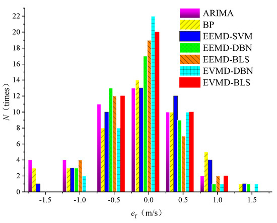 In comparing the evaluation index of the seven models, the forecasting models using time–frequency analysis perform significantly better than the ARIMA and BP models. Among the three EEMD forecasting models, the EEMD-DBN and EEMD-BLS models outperform the EEMD-SVM model, while the EEMD-BLS model has the faster running speed. In both of the models using DBN, the EVMD-DBN model has higher prediction accuracy and efficiency than the EEMD-DBN model; however, the amplitude of the high-frequency component of the EEMD is large, and affects overall prediction accuracy. Furthermore, the Gaussian white noise introduced by the EEMD in signal decomposition increases computation time. Compared to the EVMD-DBN model, the EVMD-BLS model has higher wind speed forecasting accuracy and can greatly reduce computing time. Statistical analysis of the forecasting errors of the seven models was performed, and the results are presented in Figure 12.