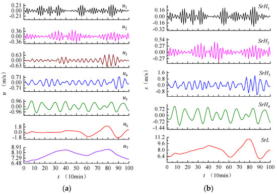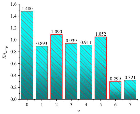 In Figure 14, the horizontal axis u value of 0 represents the sample entropy of the undecomposed wind speed data, u0. The sample entropy values of each subseries u1~u7 are 60.32%, 73.68%, 63.47%, 61.56%, 71.10%, 20.22% and 21.69% of the sample entropy value of u0, respectively, and the minimum sample entropy, Ensamp,min, is 0.299. The high-entropy-value subseries were screened as u1~u5 and the low-entropy-value sequences as u6 and u7 using the method shown in Figure 6, with 1.2 Ensamp,min as the threshold. The subseries u6 and u7 were reconstructed as the new subseries SrL, and the adjacent high-entropy subseries were reconstructed with the requirement that the change in Ensamp did not exceed 10%. The reconstructed subseries are shown in Figure 13b. The nascent subsequence SrH1 is u1, SrH2 is u2, SrH3 is u3 combined with u4, SrH4 is u5, and SrL is u6 fused with u7. In the EVMD-SR-BLS-ARIMA model, the forecasting results of the nascent high-entropy subseries SrH are calculated by the BLS model, while the ARIMA model obtains the forecasting result of the new low-entropy subseries.