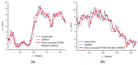 This paper used two different days of wind speed data from the same wind farm (collected on 6 and 13 January 2016) to verify the applicability of the model; the results are shown in Figure 17. Compared with the ARIMA model, the p-value and DM-value of the error-corrected EVMD-SR-BLS-ARIMA model are 0.045 and 2.057, and its δsMAPE is 7.41% less than that of ARIMA (10.58%) for 6 January 2016; the p-value and DM-value of the error-corrected EVMD-SR-BLS-ARIMA model are 0.033 and 2.20, and its δsMAPE is 6.62% less than that of ARIMA (7.73%) for 13 January 2016. Hence, the proposed model has better applicability.