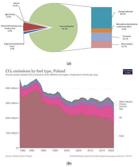 (a) CO2 emissions excluding LULUCF by sectors in 2018 [18], (b) CO2 emissions by fuel type [19] in Poland.