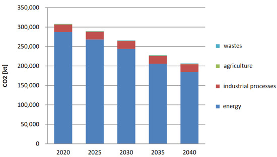 Reduction of CO2 emission by sectors (without LULUCF) to 2040 (source: [21]).