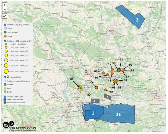 Locations of the largest CO2 emitters and storage sites in Upper Silesia (based on: https://www.strategyccus.eu/sites/default/files/Upper_Silesia/index.html#9/50.3795/19.6655 (accessed on 16 June 2022)).