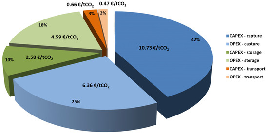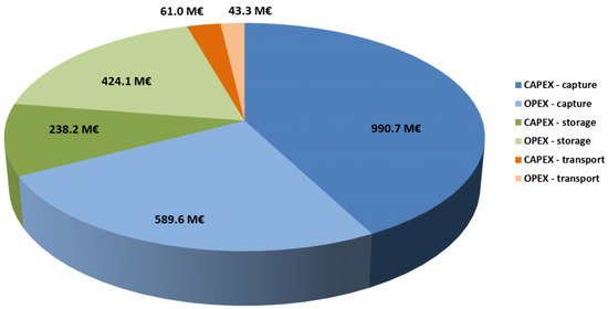 Total discounted CAPEX was estimated at EUR 1289.8 M, including capture (EUR 990.7 M), transport (EUR 61.0 M) and storage (EUR 238.2 M). The total discounted OPEX for the analysed period amount to EUR 1054.3 M, including capture (EUR 586.9 M), transport (EUR 43.3 M) and storage (EUR 424.1 M). Therefore, the total discounted CAPEX and OPEX amount to EUR 2344.2 M (Figure 5).