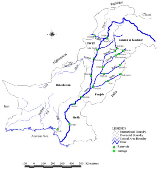 Layout of Indus River system network of barrages and reservoirs [20].