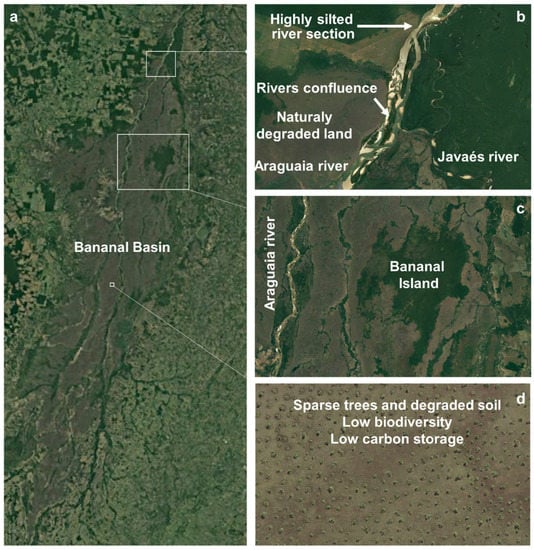 (a) Bananal basin, (b) silted bottleneck that causes flow restriction and floods, (c) Bananal Island, with higher altitude than the surrounding area, not regularly flooded and manages to sustain a dense forest, (d) Bananal plain, degraded land with sparse trees and low biodiversity and carbon storage [24].