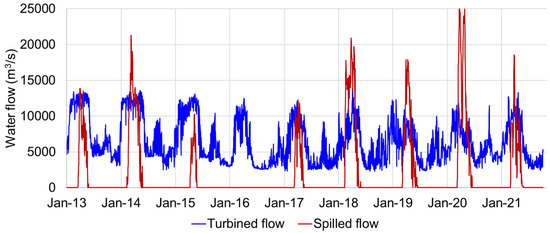Another issue in the Araguaia basin is the lack of river flow regulation, which results in a significant loss in hydropower potential in the Tucuruí hydroelectric power plant in the Tocantins River. The spilled and turbine water flow of the Tucuruí dam is presented in Figure 4.