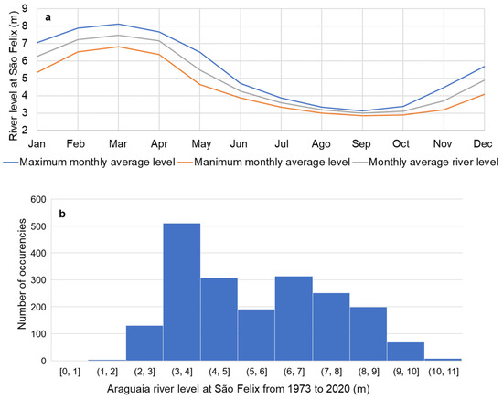 Araguaia’s monthly river level at São Felix do Araguaia presented by (a) maximum, minimum and average monthly river level (b) histogram of monthly river level from 1973 to 2020 [38].