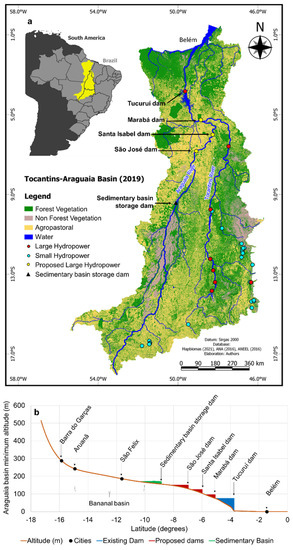 - Pelicice, F.M.; Agostinho, A.A.; Akama, A.; Andrade Filho, J.D.; Azevedo-Santos, V.M.; Barbosa, M.V.M.; Bini, L.M.; Brito, M.F.G.; dos Anjos Candeiro, C.R.; Caramaschi, É.P.; et al. Large-scale Degradation of the Tocantins-Araguaia River Basin. Environ. Manag. 2021, 68, 445–452. [Google Scholar] [CrossRef]