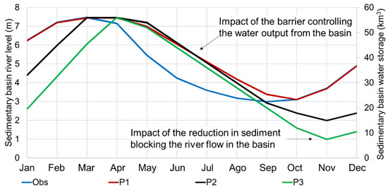 Figure 12 presents the observed (Obs) sedimentary basin river level and water storage (in blue). These values assume the observed average river level presented in Figure 10a. This is the sedimentary basin storage capacity operation, which already provides some level of storage to the river flow. However, due to the lack of control of the river level, the water exits the basin rapidly after the end of the wet period. Figure 12 presents three proposed operations for the Bananal sedimentary basin storage. The three proposed operations include the São José, Santa Isabel, and Marabá dams described in Figure 11b. The first proposal (P1) adds the Sedimentary basin storage dam, which controls the water exiting the basin and allows the water to remain for a longer time in the sedimentary basin. The second proposal (P2) adds the Sedimentary basin storage dam and involves the construction of a shallow canal, which allows more water to be extracted from the basin during the dry period and, thus, more water can be stored in the basin. The third proposal (P3) adds the Sedimentary basin storage dam and involves the construction of a deep canal, which allows even more water to be stored in the basin. Note that P2 and P3 have to be analysed with great care, as deliberately lowering the river level of the river during the dry period could have detrimental impacts on the environment and society (mainly tourism, fishing, and waterways [45]). These impacts should be considered when developing the project. Figure 13 shows the impact of the sedimentary basin water storage operation in the inlet flow to the dams downstream. The methodology implemented to create these scenarios was a simple mass balance equation assuming no changes in evaporation in the basin and with the intent of maximining hydropower generation. Figure 14 shows the impact of the operation of the sedimentary basin storage in the turbined flow of the dams downstream.