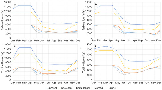 Estimated turbine flow in existing and proposed dams (a) Observed, (b) P1, (c) P2, and (d) P3.
