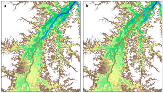 (a) Hydropower reservoir from the Bananal sedimentary basin storage hydropower plant (in brown), (b) riverbed area to be dredged to prevent flood and regulate the river flow (in orange).
