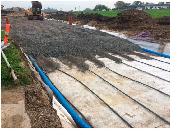 Ø160 mm drainage pipes with slits were then placed on top of the bentonite membrane in small trenches on the sides and ends of the pit (blue pipes in Figure 2). Two equally spaced 200 m Ø40 mm PE geothermal pipes were then placed on top of the bentonite membrane in a W-configuration and then covered with soft, rounded gravel (black pipes covered with small mounds of soft gravel in Figure 2). With the piping in place, construction of the roadbed commenced. The roadbed material consisted of well-sorted gravel from which all fine-grained material was removed to ensure high porosity. Moreover, the gravel was designed to preserve its structural integrity when fully saturated with water. Information pertaining to the construction materials is listed in Table 1.