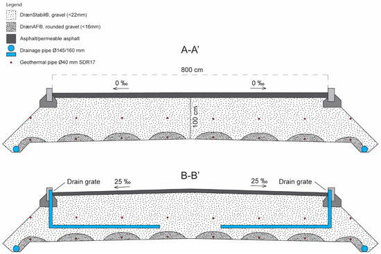 Transect of the road sections with permeable (A-A’) and traditional asphalt (B-B’), respectively. A-A’ and B-B’ refer to the transects shown in Figure 1. The permille and arrow labels refer to the inclination of the road surface and its direction. The illustration is not to scale.