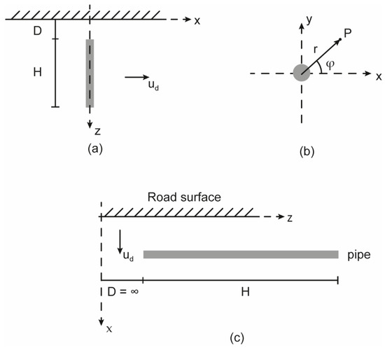The model was initially developed for vertical borehole heat exchangers (BHEs), where burial depth refers to the distance between the top of the BHE and the ground surface (see Figure 4a). In the present case, the geothermal pipes are placed horizontally with vertical infiltration. Therefore, the distance D effectively becomes infinite (see Figure 4c). The corresponding limit in Equation (3) is