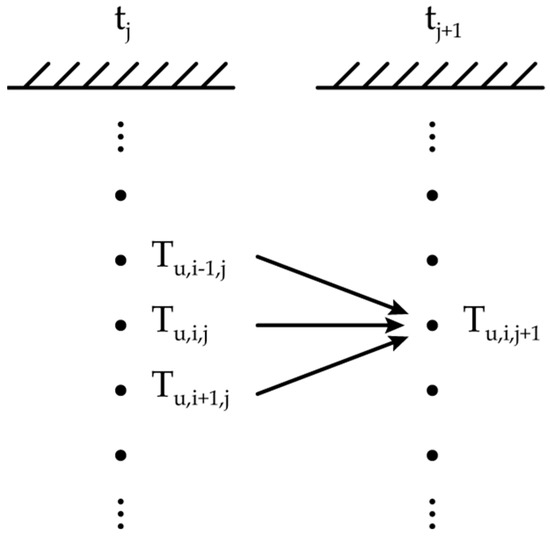 As indicated in Equation (13), the temperature of the roadbed during operation is calculated by superposition of the seasonal variations in roadbed temperatures and the temperature change incurred by GSHP heat extraction. The undisturbed roadbed temperature Tu(x,t) is estimated by a 1D numerical Crank–Nicolson finite difference discretization of Equation (1) that adequately captures the propagation of the road surface temperature variations into the subsurface [28]. The scheme is unconditionally stable for any combination of time and space discretization and is second-order accurate in time. The temperature at model node i and timestep j (see Figure 6) is calculated from the preceding timestep according to