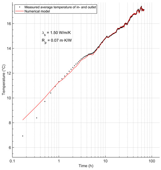 Numerical model interpretation of the TRT of the roadbed geothermal piping from the Thermoroad (duration: 48 h).