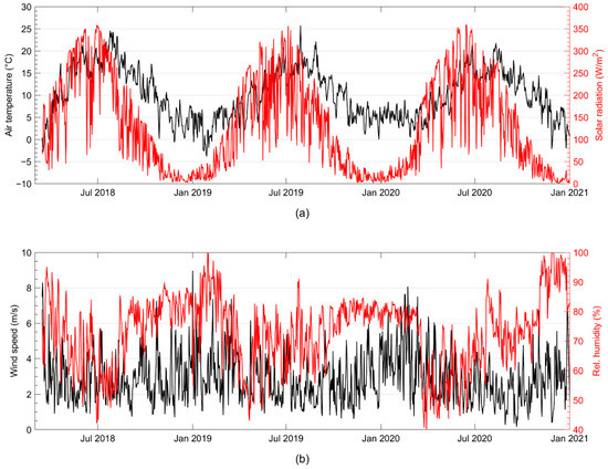 (a) Measured daily average air temperature and solar radiation at the Climate Road. (b) Wind speed and relative humidity at the Climate Road.