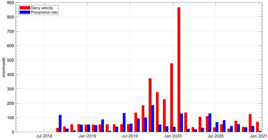 Monthly measured precipitation and estimated Darcy velocity from flow meter measurements.