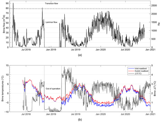 (a) Brine flow and Reynolds numbers (Re) during operation. (b) In- and outlet temperatures during operation. The hiatus in operation between 12 November 2018 and 19 March 2019 was due to a fluid pressure issue during which the original collector pipes for the GSHP were used.