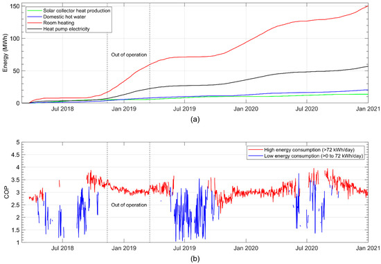 (a) Domestic hot water, room heating, and electricity consumption by the heat pump and solar collector heat production. (b) Daily averages of COP. “Out of operation” refers to the geothermal piping in the roadbed, not the GSHP, as the original ground collectors were used instead during this period.