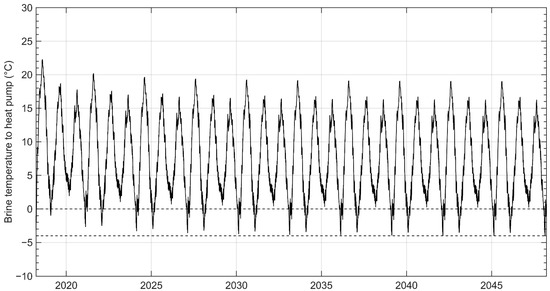 Assuming a roadbed thermal conductivity of 1.50 W/m/K and an annual infiltration of 1460 mm, the thermal load time series needed to be reduced by 54% to ensure brine temperatures above −4 °C during continued operation for 30 years, corresponding to a total annual heat production of 30.2 MWh, including the electricity consumption by the heat pump (Figure 13).