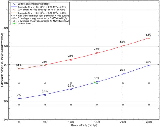 In Figure 14, the vertical dashed line indicates the expected Darcy velocity when draining rainwater from three dwellings directly to the roadbed (i.e., from house roofs and fortified surfaces). We assumed a direct runoff area fraction of 25%. Assuming a plot area of 800 m2 per dwelling, the road catchment area increased by 600 m2 in addition to the road surface (400 m2). Based on a total drained area of 1000 m2, a conservative estimate of the corresponding Darcy flux in the roadbed was 2000 mm per year, as runoff from non-fortified areas to the Climate Road was not considered. Compared to a traditional GSHP without infiltration, the extractable energy increased by 26% when 2000 mm of water was infiltrated annually. In this case, the Climate Road was clearly able to supply three dwellings each with an annual heating consumption of 8 MWh. It is also likely that 10 MWh of heating can be supplied to each dwelling annually. Seasonal energy storage of excess heat from the buildings, solar collectors, or other energy sources significantly increased the amount of extractable energy. Storing 30% of the annual heating consumption increased the extractable heat by 56% when infiltrating 2000 mm of rainwater per year. In this case, heat supply was guaranteed for an annual heat consumption well above 10 MWh per dwelling. Generally speaking, the increase in extractable energy is proportional to the energy stored.